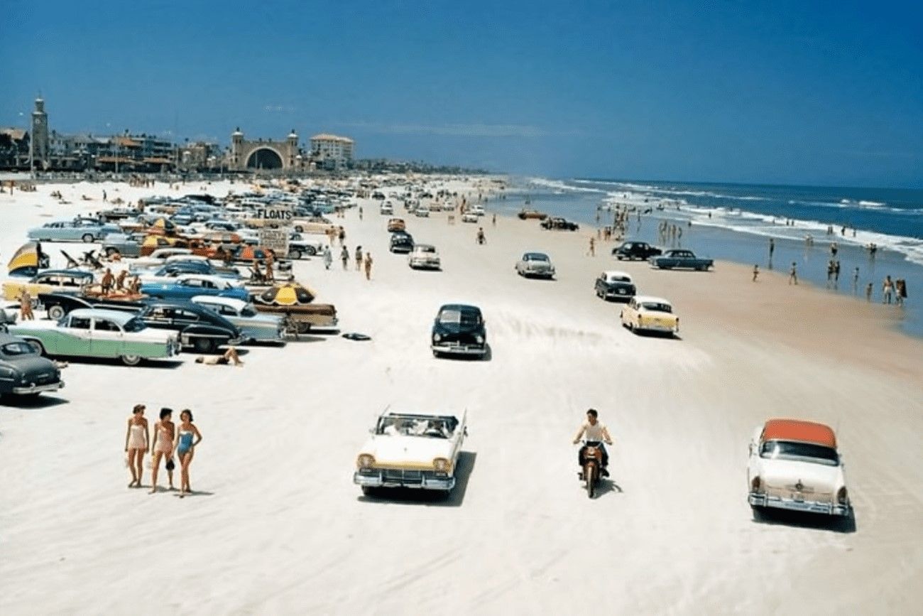 Daytona Beach has long been a popular destination for tourists thanks to its sand that has been firmly packed and is sturdy enough for cars to drive on. This 1957 photo effectively portrays the vibrant atmosphere of the location.
